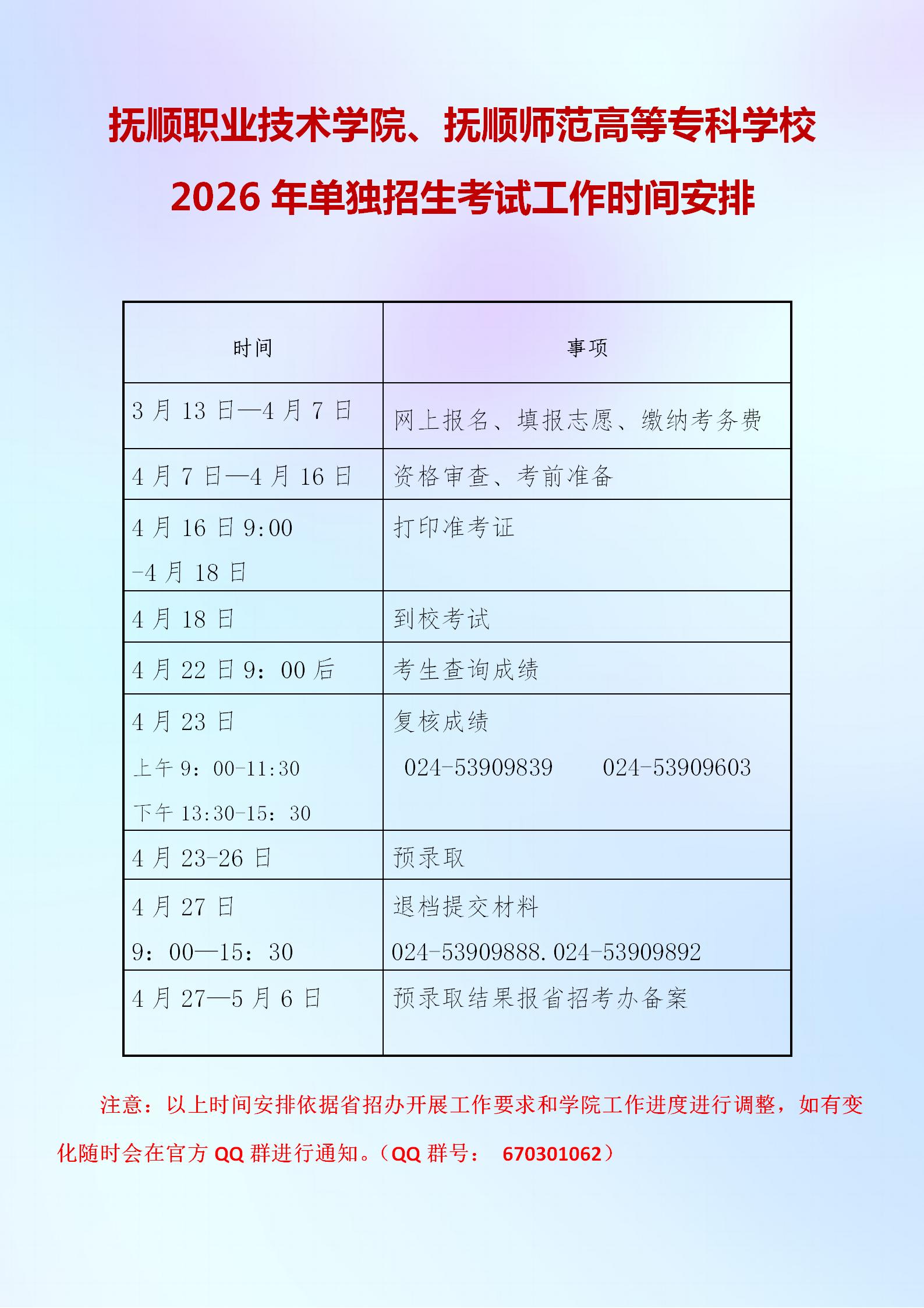 2026年抚顺职业技术学院(抚顺师专)单独招生考试时间工作安排