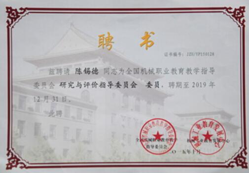 2016年3月3日前夕,副院长陈锡德被全国机械职业教育教学指导委员会聘任为研究与评价指导委员会委员,聘期四年。