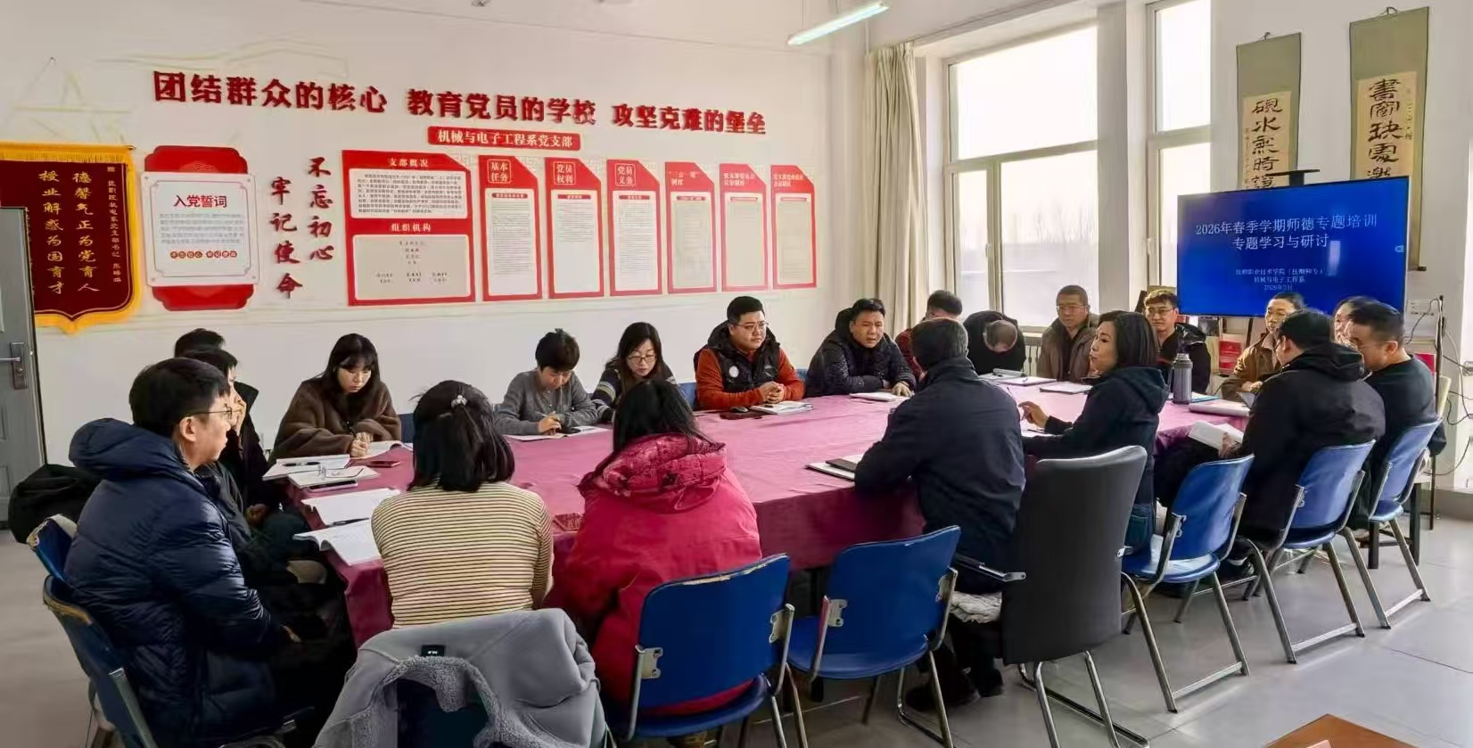 为深入落实学院(校)2026年春季学期师德专题培训工作部署,筑牢教师队伍师德师风思想根基,2月28日上午,机电系党支部在系活动室组织开展师德师风专题学习与研讨活动。党委副书记、院(校)长牛舜全程参与活动并作重要讲话,支部全体党员教师参加,活动由支部书记主持。