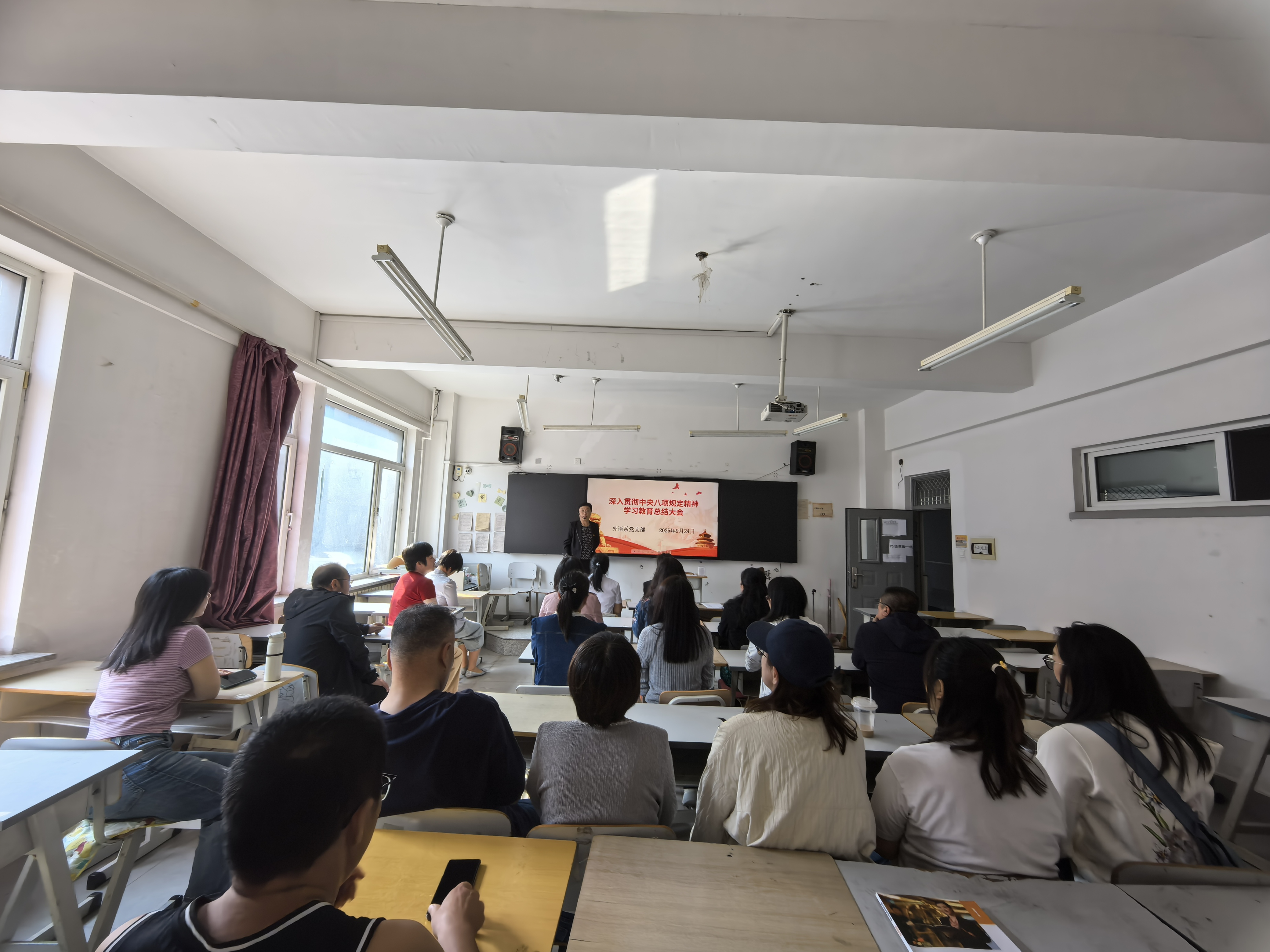 2025年9月24日,外语系党支部在1号楼203教室召开深入贯彻中央八项规定精神学习教育总结大会,会议由党支部书记主持,全系党员参会。
