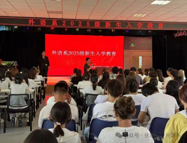 为帮助 2025 级新生快速适应大学环境、明确成长方向,新生入学教育是整个大学教育的起点,是新生入学后大学生涯的第一课,也是新同学尽快了解大学、适应大学学习生活、树立新的奋斗目标的重要一环。外语系于 2025年9月8日举办2025级新生入学教育活动。活动由外语系栾贺副书记主持,外语系张书记担任主讲人,2025级全体新生参会。
