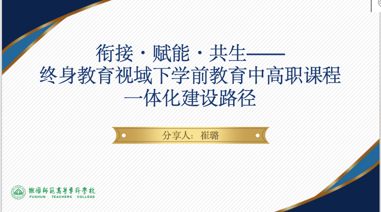 崔璐教师在“学前教育职业教育提质研究”分论坛中,以《衔接·赋能·共生——终身教育视域下学前教育中高职课程一体化建设路径》为题,系统分享了我系在高职学前教育领域的实践探索与研究成果。从当前学前教育专业的中高职衔接面临的具困境入手,提出了四个方面的破解路径,干货满满的分享获得了与会嘉宾的关注与认可,为全省学前教育职业教育高质量发展提供了鲜活参考。