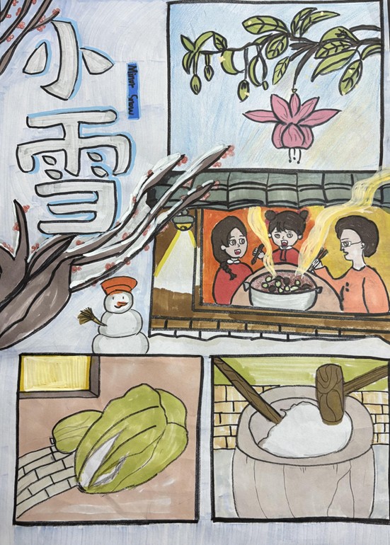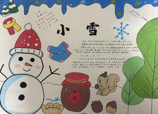 本次“品韵小雪·悦享暖冬”主题活动同学们充分了解了活动目的《月令七十二候集解》中提到的“十月中,雨下而为寒气所薄,故凝而为雪,小者未盛之辞。”意思是此时天气寒冷,降水形式由雨改为雪,但由于“地寒未甚”,雪量还不足,所以称为小雪。