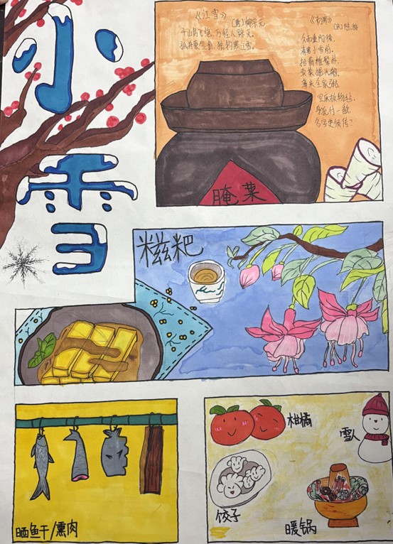 在此次活动中,同学们通过视觉元素(如雪花、糍粑、腌菜等),能快速让大众知晓活动主题与内容,相比文字更易抓住注意力。通过本次活动让我们认识小雪,了解到了小雪节气的由来、小雪的气候特征、小雪三候、小雪吃什么,更了解到了中国传统节日的博大精深,和悠久历史。
