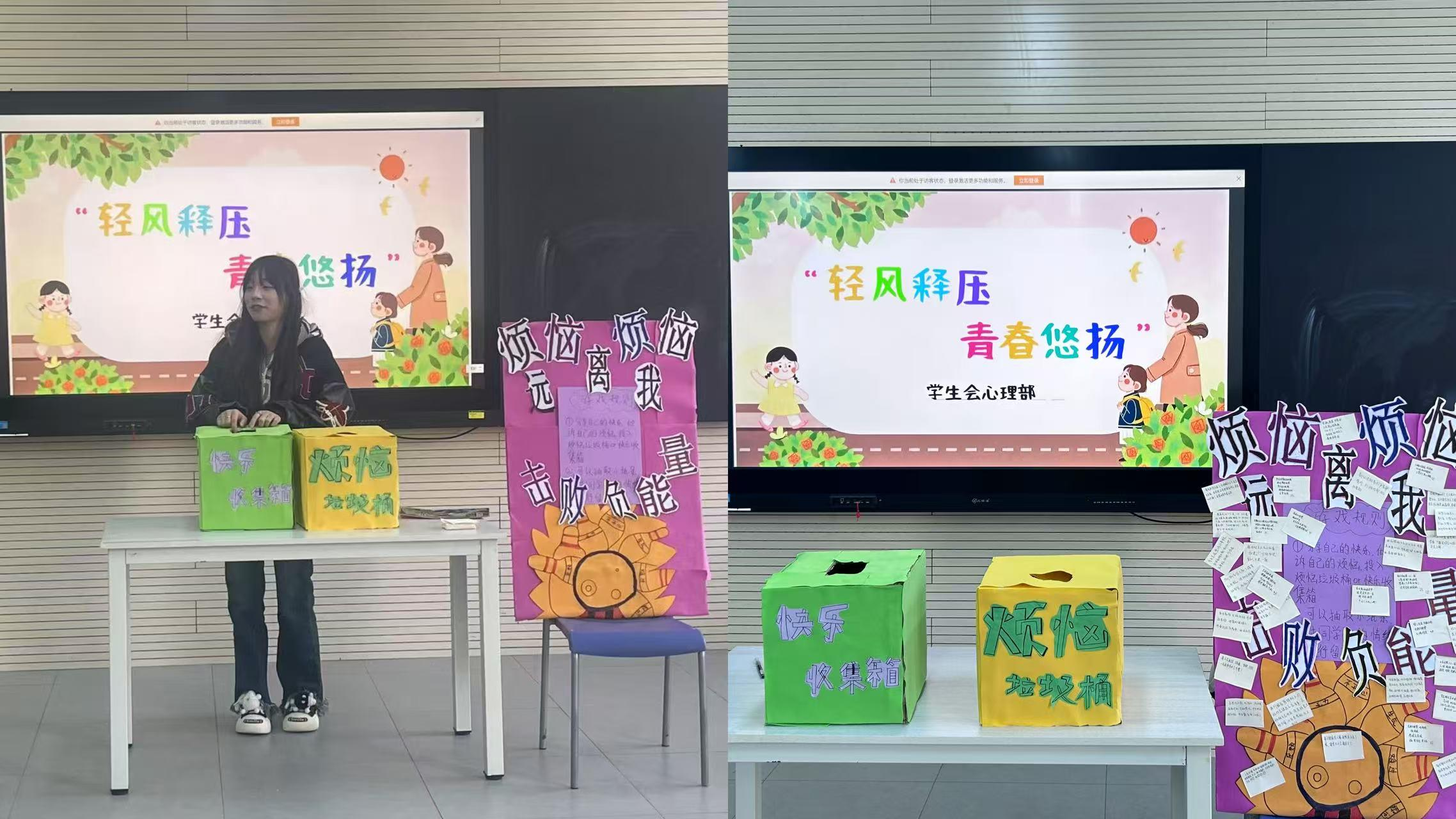 参加本次活动的是23、24级成员,活动开展前由学生会心理部通知各班负责人活动的要求和注意事项,以同学们安全第一的前提,通过室内外游戏的形式开展活动,室内活动包括“心情交换箱”和“烦恼远离我贴标签”,室外活动包括“心声漂流瓶”和“流浪纸飞机”,这些游戏不仅帮助大家减少了烦恼,还鼓励同学们积极向上,保持开心快乐的情绪,和烦恼说再见。