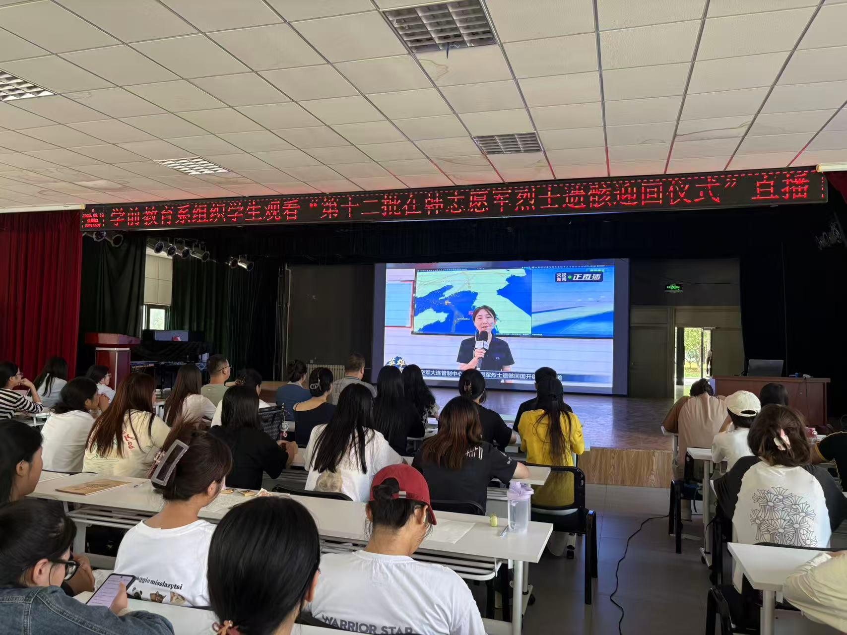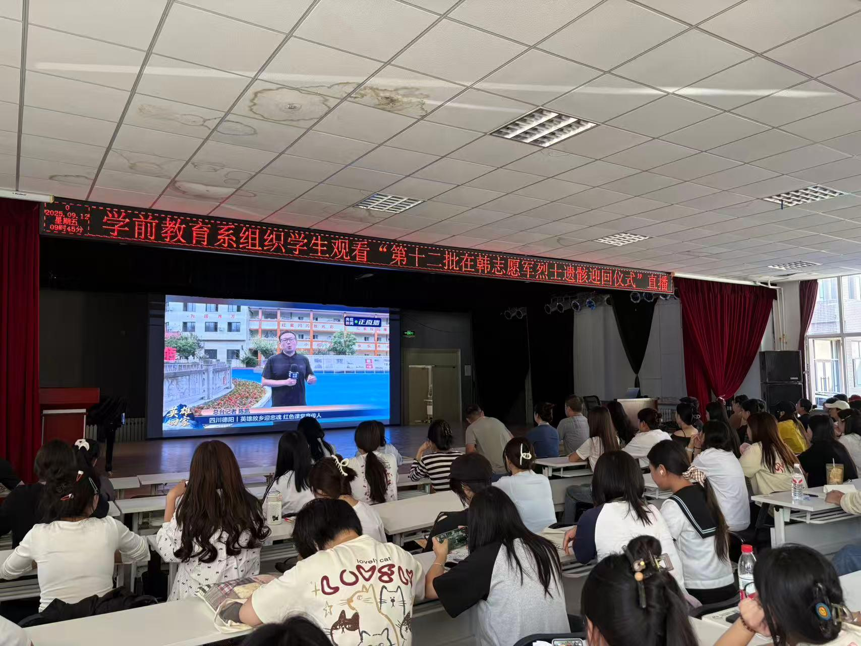 为响应辽宁省教育厅“大思政课”建设号召,厚植师生爱国主义情怀,9月12日上午,学前教育系领导及无课师生,在107教室组织同步收看第十二批在韩志愿军烈士遗骸迎回仪式直播,以庄重方式迎接英烈“回家”,传承红色精神。