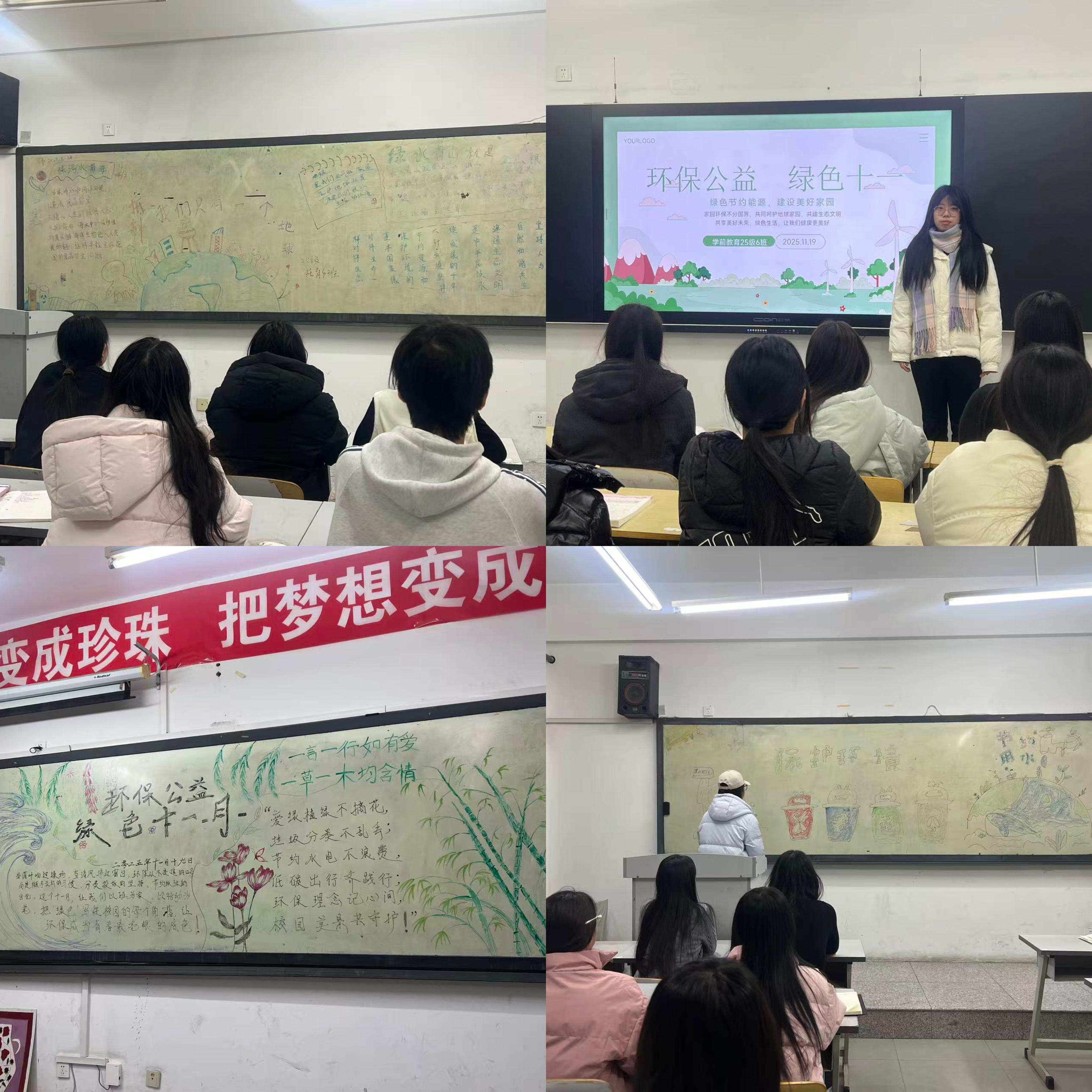 绿色十一月,青春赴“碳”约!当落叶铺成金色地毯,让环保住进我们心间,节约一滴水、少用一张纸,垃圾分类投、低碳出行走小小的坚持能汇成生态暖流,学前教育系学生会学习部于2025年11月19日组织开展了《环保公益,绿色十一月》主题班会活动。