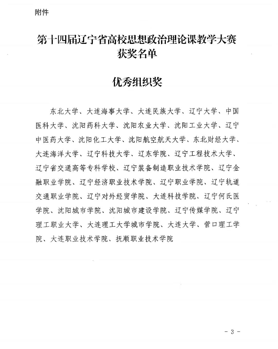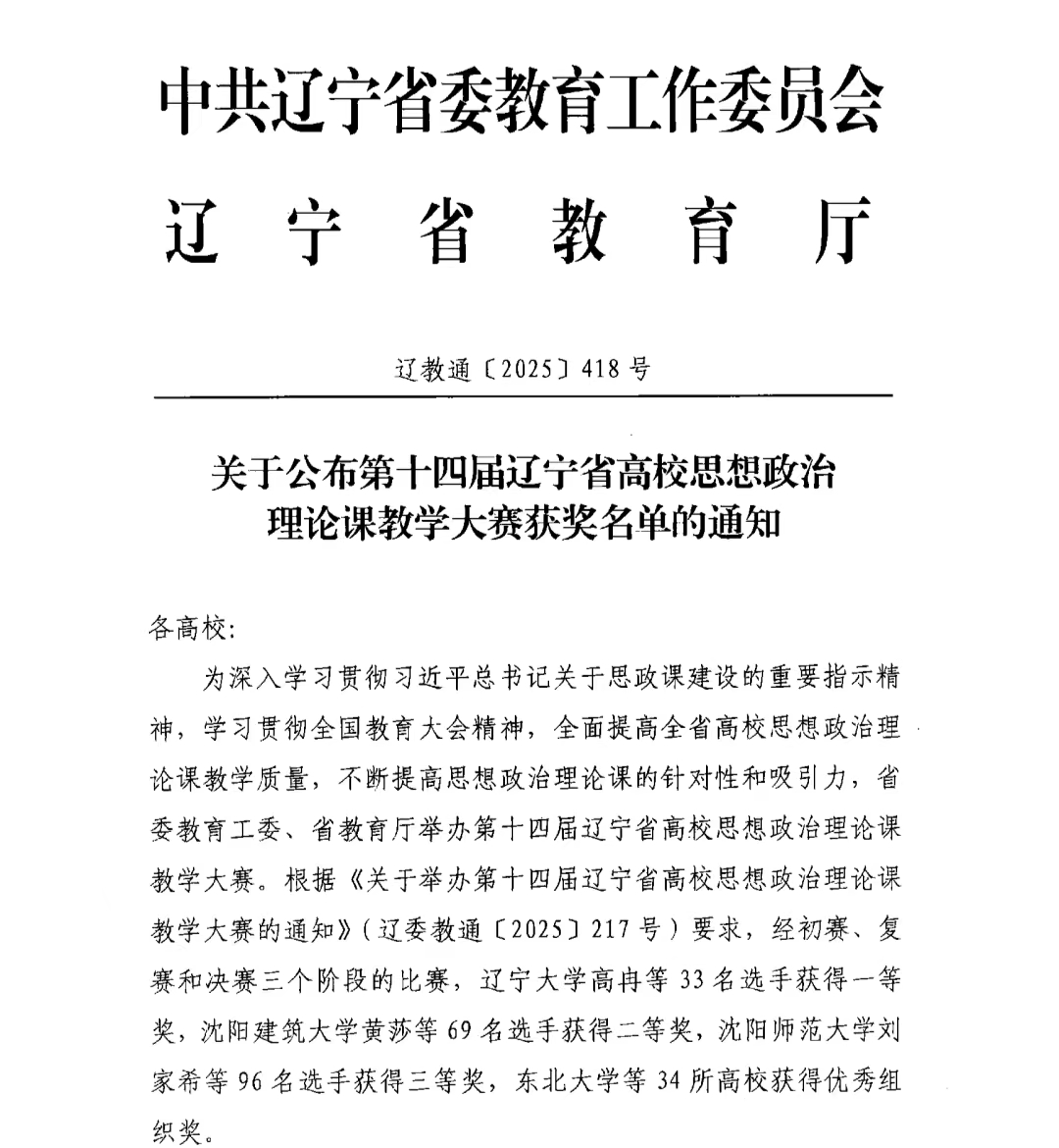 近日,由中共辽宁省委教育工作委员会、辽宁省教育厅联合主办的第十四届辽宁省高校思想政治理论课教学大赛结果揭晓。我院(校)马克思主义学院杜铭、孙长明两位教师分获《形势与政策》课程组二等奖和《习近平新时代中国特色社会主义思想概论》课程组三等奖,刷新了近五年参赛以来的最佳成绩。同时,学院(校)荣获大赛“优秀组织奖”。本次赛事汇聚全省89所高校465名教师参与,竞争激烈。学院(校)党委高度重视备赛工作,通过系统部署、邀请校内外专家指导及组织反复研讨演练,为参赛教师提供了全方位支持。此次佳绩不仅彰显了教师个人的教学能力,更体现了学院(校)在深化思政课教学改革、推进“大思政”育人格局建设中的扎实成效。