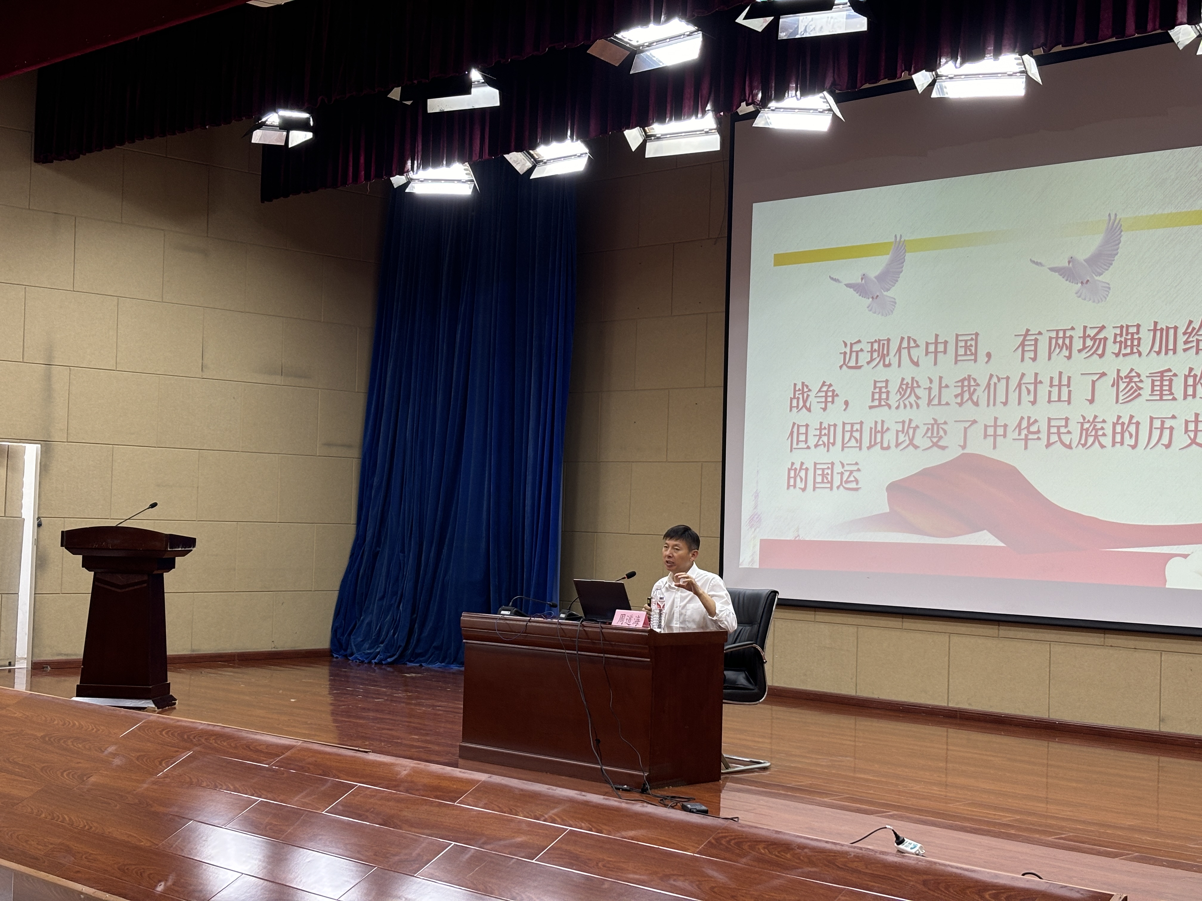 2025年9月25日,辽宁雷锋干部学院雷锋精神研究员、辽宁省全民国防教育讲师团专家、原雷锋团副政委周道海走进我院(校),以“以史为鉴 勇毅前行——抗日战争伟大胜利的战略思考”为主题,为百余名师生带来了一场深刻而生动的国防教育讲座。抚顺市委宣传部杨拥军同志莅临现场,与师生们共同聆听这堂意义非凡的爱国主义教育课。